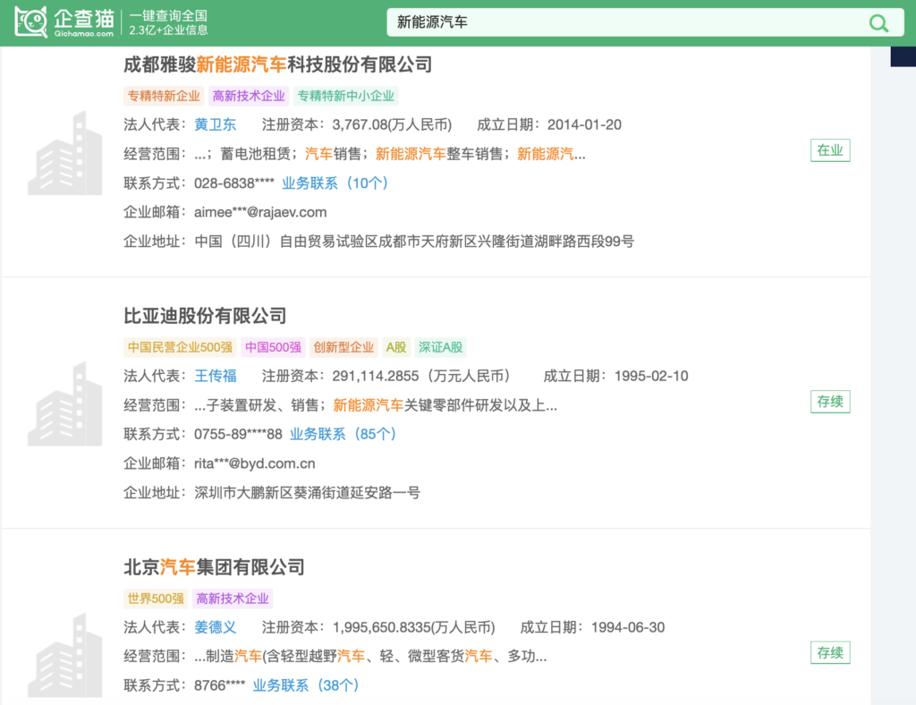 例えば、新エネ車の企業をリストアップしたい時は、検索ボックスに「新能源汽车(xin neng yuan qi che)」と入力し検索します。