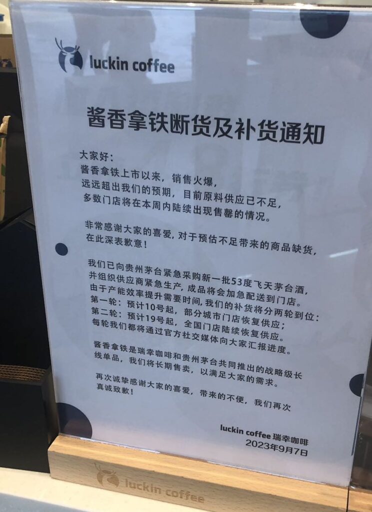 販売元のluckin coffee(瑞幸咖啡=ラッキン。以下、luckin)店頭に貼り出された「在庫切れ及び再入荷の通知(右の画像)」によると、予想を遥かに上回る売れ行きで供給が間に合わなくなったそうです。