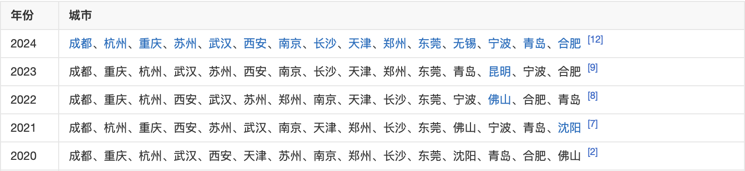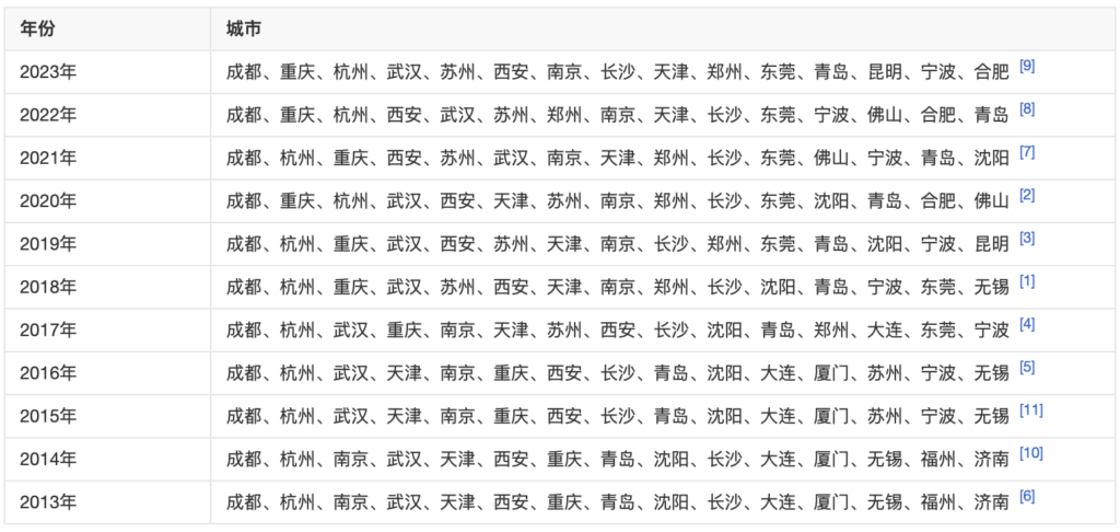 1線都市は、上海、北京、深圳、広州の各市で不動となっていますが、新1線都市は以下の通り、変化があるのは興味深いところです。