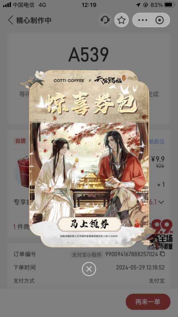 COTTIの競合であるluckin coffee(瑞幸咖啡=ラッキンコーヒー。以下、luckin)も、対抗して毎週一回限定であるものの、同額9.9元/一杯のクーポンを配布しており、この値下げ競争はいつまで続くのか、中国の個人消費を測る温度計になる、と記事を締めています。