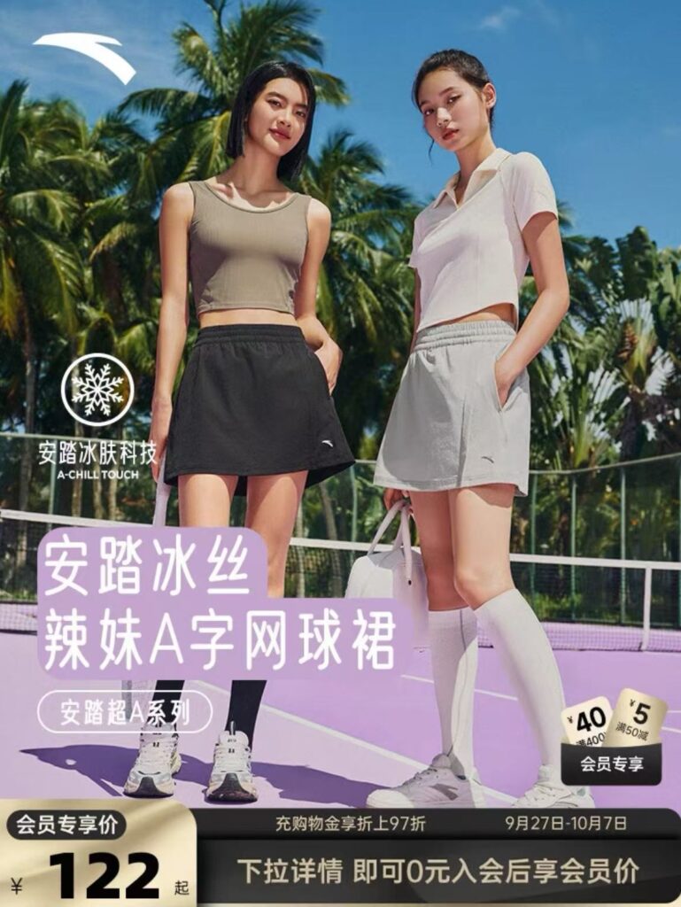 安踏(ANTA)は、99元のベーシックモデルのテニススカートを発売し、デカトロン(Decathlon)の機能性テニススカートは、わずか129元で販売されている。これらの製品により、一般の消費者も、ファッションの潮流に乗ることができる。