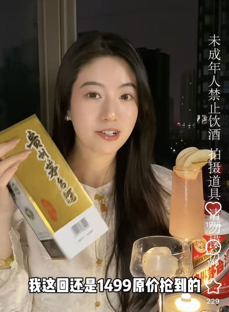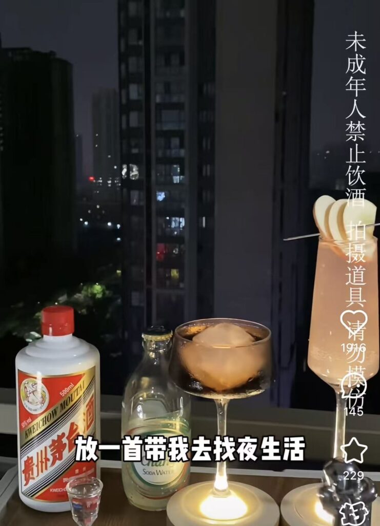 (SNS「小紅書」で「茅台 下班微醺时刻(仕事終わりのほろ酔い)」と検索すると、1,499元でマオタイを購入した30歳・独身という女性がマオタイを使いカクテルを自作するショート動画が見つかりました。/画像はN22追記)