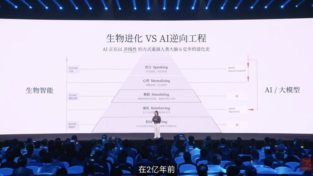 生物是先从行动进化到思考,再进化到语言,但是大模型是先学会了语言,再去补齐他的思考能力,再去最终对物理世界的一个模拟以及具身的一个感知。