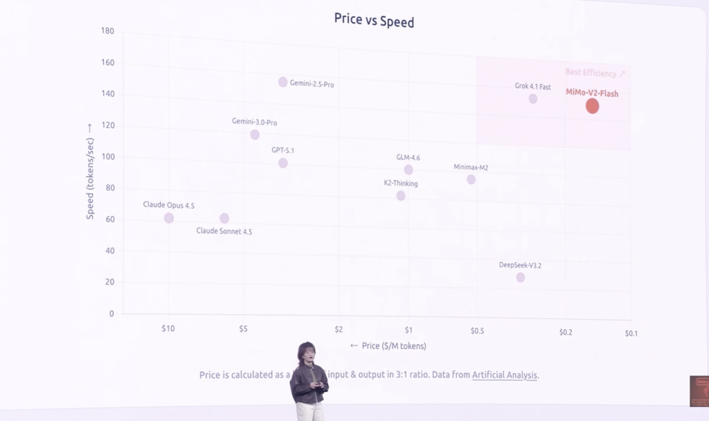 举两个base line来进行对比。比如说「DeepSeek V3.2」,它的『MiMo-V2』比「DeepSeek V3.2」更便宜一点。但是呢它的推理速度是「V3.2」的大概3倍左右。