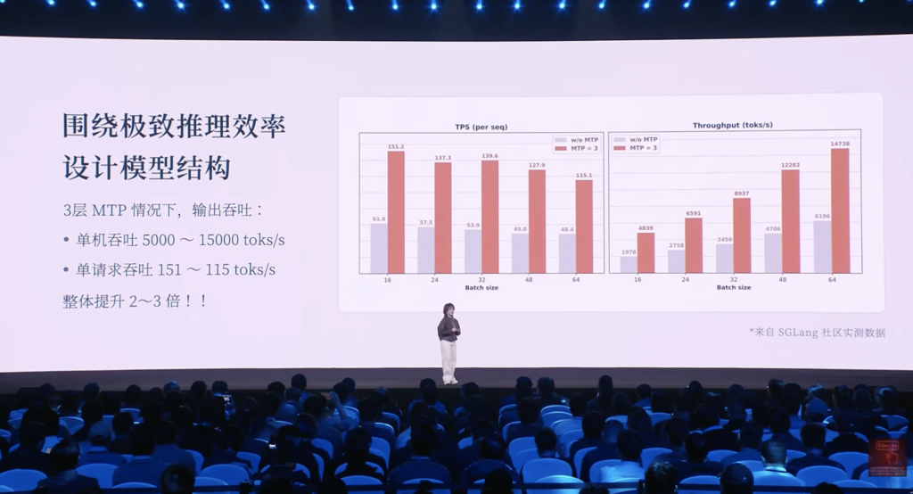 这样一种最终我们推理的时候呢,是使用了三层的MTP。这种加速并行的去进行TOKEN验证的方式呢,在我们实际的推理加速的场景里边能够做到2到2.6倍的一个实际的推理加速的一个提升。